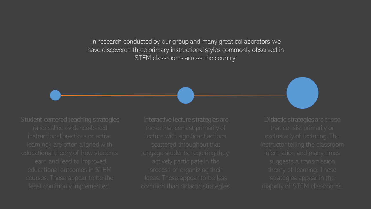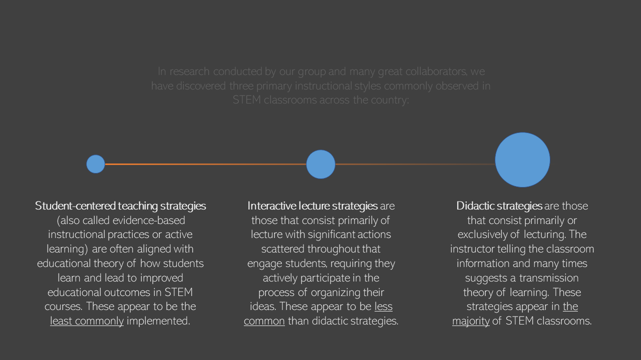 We in the educational research community have known for some time that active learning strategies have a great potential to engage students for meaningful learning in tertiary STEM education and thanks to research conducted by many of our collaborators have now provided evidence that these strategies are not commonly found in STEM classrooms. Our research group is interested in further investigating patterns to be found instructor observations using the Classroom Observation Protocol for Undergraduate STEM (COPUS). Our hope is that these profiles and mini profiles will help the educational research community more directly link behaviors observed in the classroom with education outcomes.